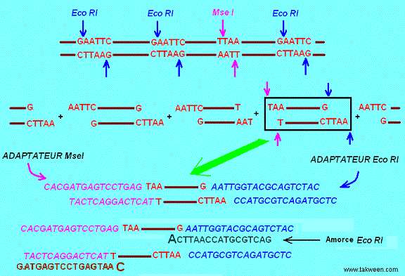 - Des adaptateurs de séquences connues et spécifiques des enzymes de restriction utilisées, sont ajoutés aux extrémités des fragments de restriction générant ainsi une matrice pour l'amplification.